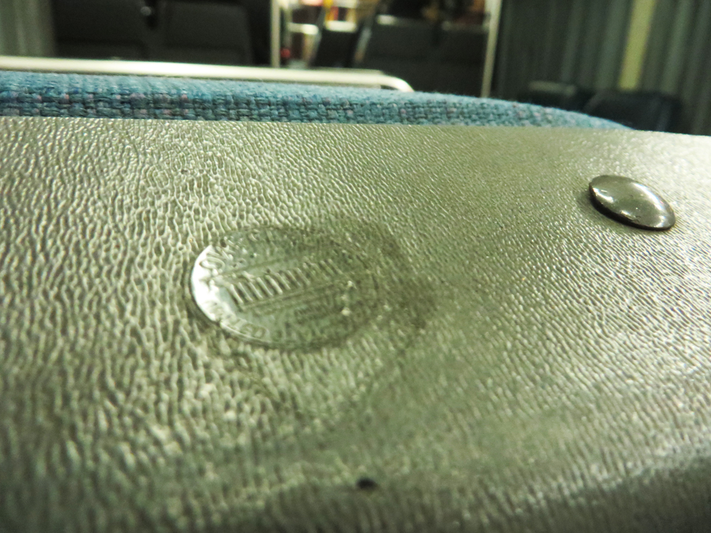 Someone gets on the bus, has a penny, heats it up with a… torch, and then presses it into the plastic of the bus seat to leave this shockingly clear impression.